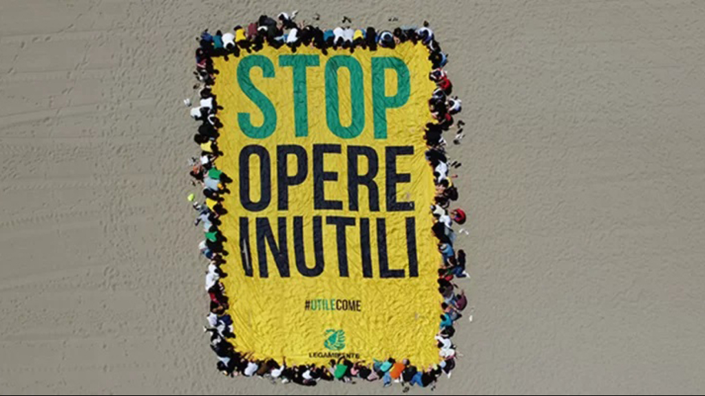 Uno striscione di 300 metri quadrati con scritto “Stop alle opere inutili” è stato srotolato domenica 28 maggio sulla spiaggia dell’Oasi dunale di Paestum, in provincia di Salerno. In azione oltre 350 attiviste e attivisti di Legambiente - è scritto sul sito dell'associazione ambientalista -, che in occasione della giornata finale dello Youth Climate Meeting 2023, hanno manifestato così il loro dissenso, indicando quelle per l’associazione ambientalista sono alcune delle opere inutili che in Italia rallentano la transizione ecologica con ingente sperpero di risorse economiche. Dal Ponte sullo Stretto di Messina ai nuovi rigassificatori, dall’impianto di Cattura e Stoccaggio dell’anidride carbonica (CCS) a Ravenna alla dorsale adriatica SNAM, dalla Tav Torino Lione all’inceneritore di Roma, dal collegamento stradale veloce tra l’autostrada A2 del Mediterraneo e la variante statale n. 18 ad Agropoli (SA) alle attività di ricerca ed estrazione di petrolio e gas in Val D’Agri, in Basilicata, solo per citarne alcune.