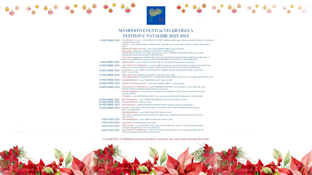 Tanti gli eventi in programma per la gioia di bambini e adulti, dalle degustazioni (di crispelle, panettoni artigianali, taglieri a base delle specialità reggine, sino al gelato al nuovo gusto “Giudecca” creato per l’occasione) ai libri e alle letture sotto l’albero, al doppio appuntamento con le “Fiabissime in Giudecca” l’8 e il 23 dicembre.