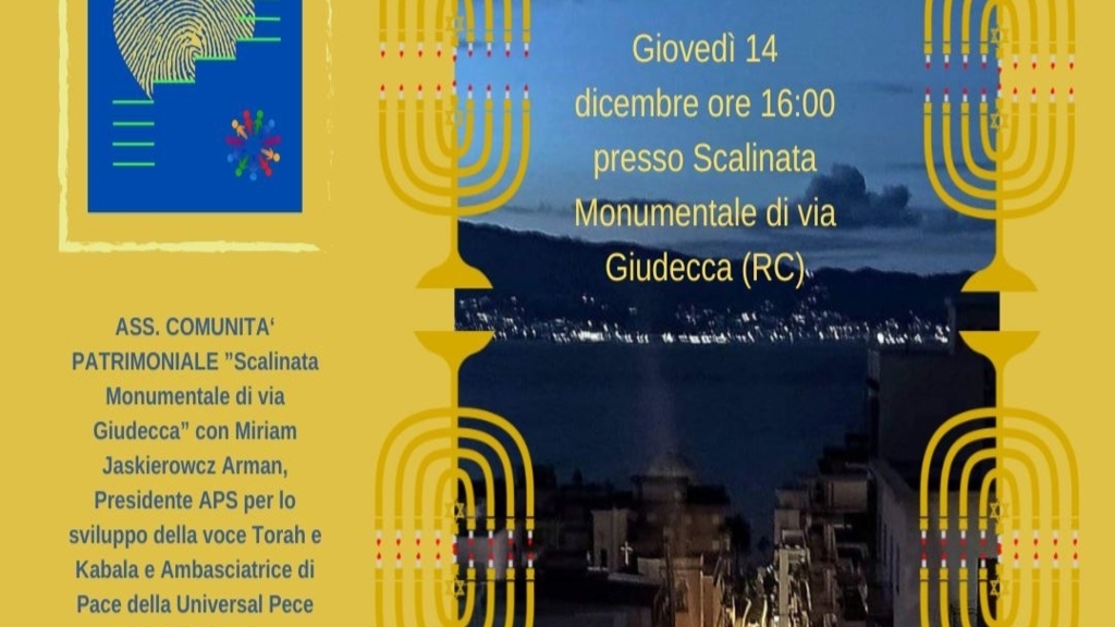 Un momento di riflessione e pace in memoria della comunità ebraica reggina. È questo il messaggio che vuole trasmettere la “Festa della luce” prevista per oggi 14 dicembre sulla scalinata monumentale di via Giudecca. L’evento, organizzato dalla comunità patrimoniale della Giudecca, vedrà la partecipazione di Miriam Jaskierowcz Arman, presidente APS per lo sviluppo della voce Torah e Kabala ed ambasciatrice di pace della Universal Peace Federation Italia.