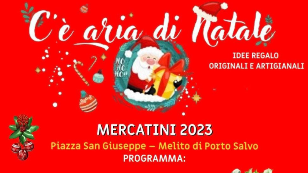 “C’è aria di Natale” a Melito Porto Salvo. Sabato 16 e Domenica 17 Dicembre, in piazza San Giuseppe, si svolgeranno i Mercatini di Natale 2023, atteso appuntamento annuale ricco di opportunità per grandi e piccoli. Trentasette stand, aperti dalle 10,00 alle 21,00, dove si potranno trovare idee regalo originali e artigianali, street food con un’area attrezzata per la degustazione dei prodotti tipici dell’Area Grecanica, e tanta musica per concludere in bellezza, con due concerti live: sabato 16 si esibiranno i Kardhja, e domenica 17 i Kairos. Un appuntamento dunque imperdibile per entrare nella magica atmosfera del Natale, organizzato dalle associazioni culturali Don Calarco e Calabriamoci, dalla parrocchia di San Giuseppe e dall’ AIL  - Delegazione di Melito Porto Salvo, con il patrocinio del Comune di Melito Porto Salvo.