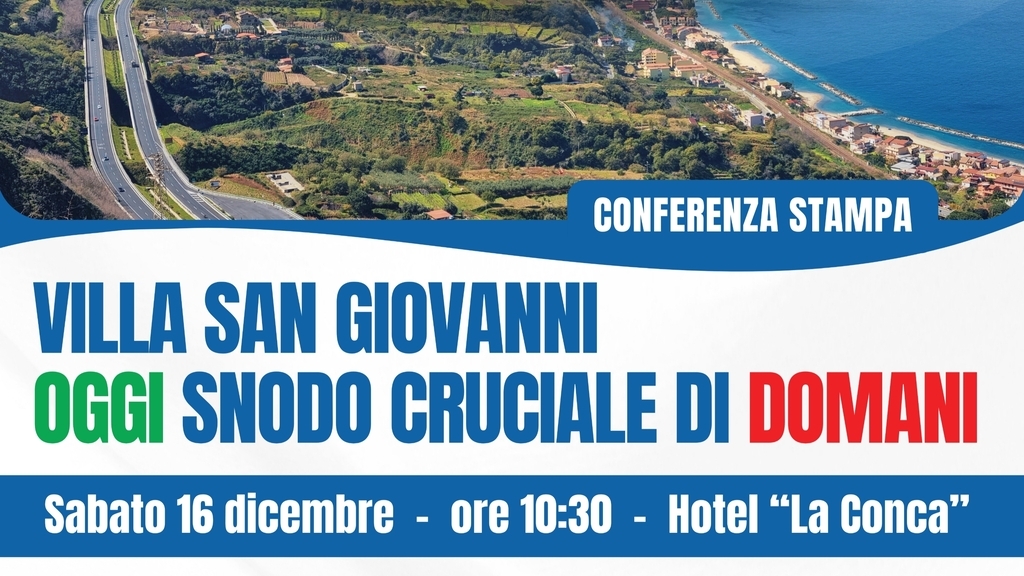 Il Coordinamento comunale Forza Italia - Villa San Giovanni ha indetto una conferenza stampa dal titolo “Villa San Giovanni, OGGI snodo cruciale di DOMANI”, che si terrà sabato 16 dicembre alle ore 10:30, presso la Sala conferenze dell’Hotel “La Conca”.