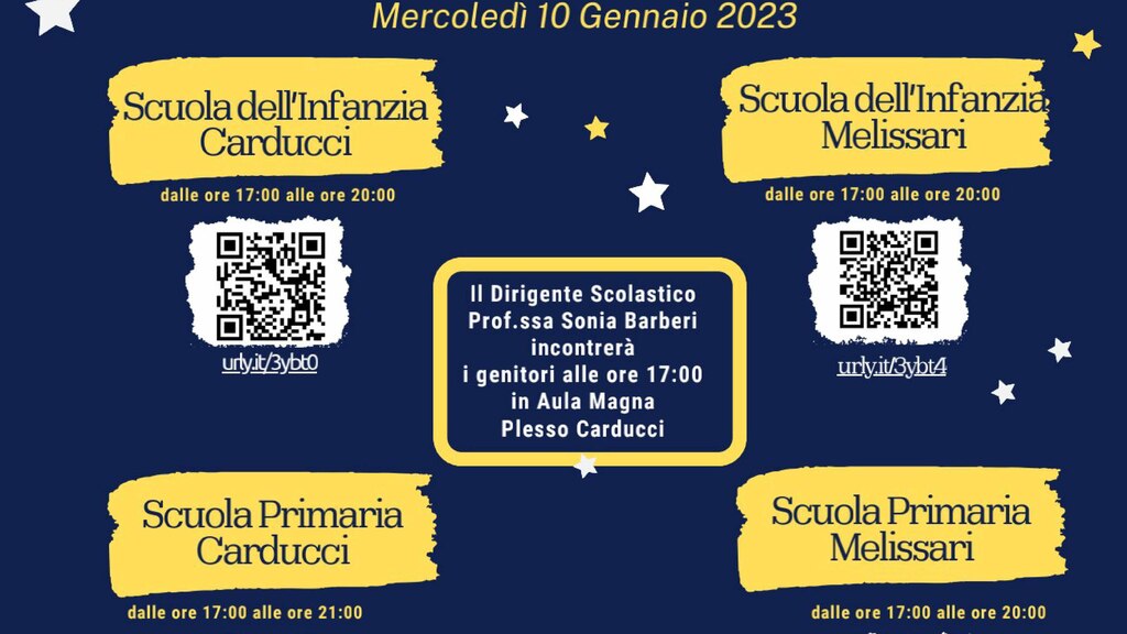 Alle ore 17:00, nell’Aula Magna del plesso Carducci, il dirigente scolastico, prof.ssa Sonia Barberi, incontrerà i genitori.