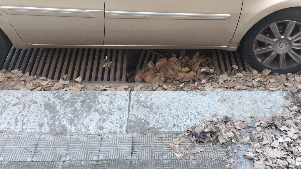 Dalle foto si puó notare la pericolositá della grata che compone parte di uno scarico fognario. Il tombino risulta totalmente spezzato e le foglie cadute per il forte vento di questi giorni, lo hanno totalmente ricoperto, non permettendo ai guidatori di constatare il pericolo.