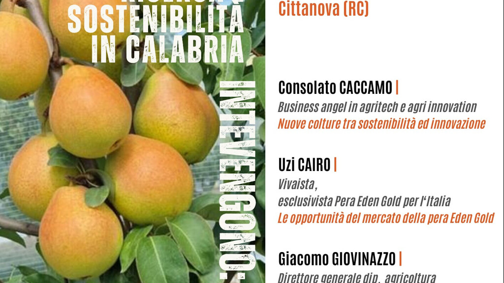 Gli interventi dei relatori, avranno dunque, come fil rouge, i risultati della ricerca e da questi la sostenibilità e l’innovazione di nuove colture. Ad aprire i lavori Consolato Caccamo, Business angel in agritech e agri innovation che tratterà proprio di “Nuove colture tra sostenibilità ed innovazione”, a seguire la relazione di Uzi Cairo, vivaista, esclusivista Pera Eden Gold per l‘Italia che esporrà “Le opportunità del mercato della pera Eden Gold”, le conclusioni saranno lasciate alla relazione di Giacomo Giovinazzo, Direttore generale dipartimento agricoltura Regione Calabria che porrà l’accento su “La Calabria tra ricerca e nuove opportunità in campo agro-alimentare”.