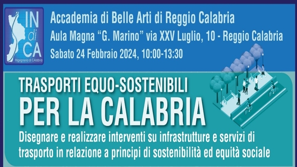 Si terrà domani sabato 24 Febbraio 2024, con inizio alle ore 10:00, presso l’Aula Magna dell’Accademia delle Belle Arti di Reggio Calabria (Via XXV Luglio n.10), un convegno di studi organizzato dall’Associazione INdiCA (INgegneria di Calabria), sulla tematica della mobilità equo-sostenibile in Calabria. L’Associazione, che ha finalità esclusivamente di promozione sociale, propone un confronto pubblico tra un gruppo di Ingegneri aderenti e rappresentanti delle Istituzioni su un tema di grande attualità. Il titolo del Convegno è: Trasporti Equo-sostenibili Per La Calabria, con un focus su proposte di interventi su infrastrutture e servizi di trasporto in relazione a princìpi di sostenibilità ed equità sociale.