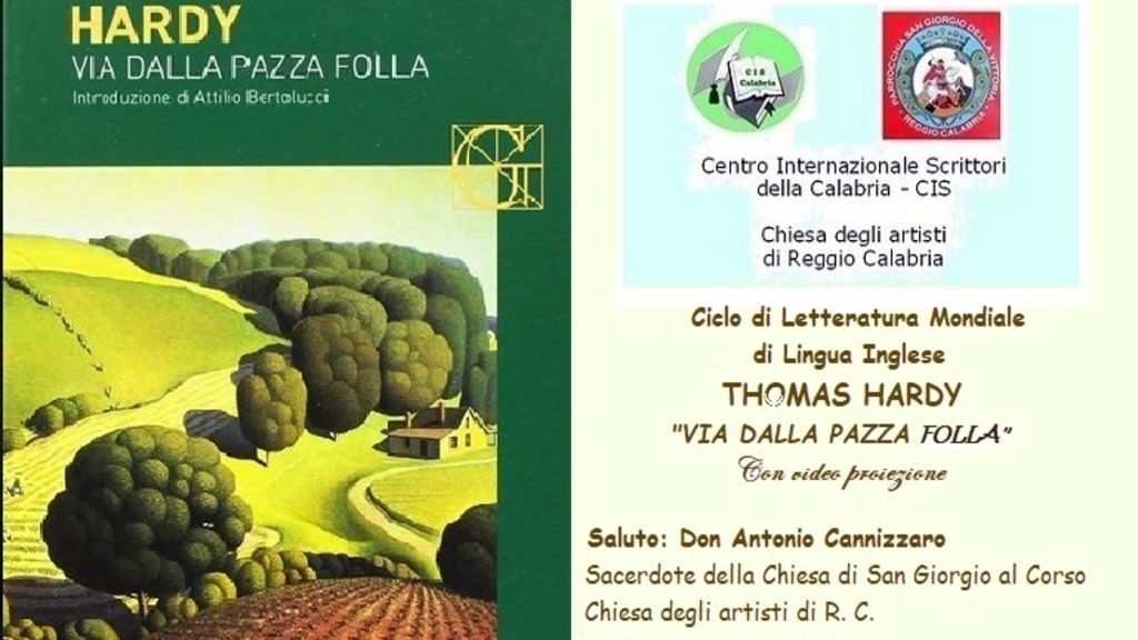 Il Centro Internazionale Scrittori e la chiesa degli artisti di Reggio Calabria, mercoledì 28 febbraio 2024, alle ore 17:30, presso la Sala San Giorgio della stessa chiesa, nell’ambito del ciclo di letteratura mondiale di lingua inglese presentano: Thomas Hardy autore del romanzo “Via dalla pazza folla”. Aprono l’incontro don Antonio Cannizzaro, parroco della chiesa di San Giorgio al Corso e Loreley Rosita Borruto, presidente del Cis della Calabria. Introduce il tema della conferenza Maria Quattrone, già Dirigente Scolastico del Liceo Classico “T. Campanella” di Reggio Calabria, componente del Comitato Scientifico del Cis. Con il contributo di video proiezione, relaziona Silvana Comi, docente di Lingua e Letteratura Inglese, componente del Comitato Scientifico del Cis. Thomas Hardy (1840 – 1928) è stato poeta e scrittore britannico, appartenente alla corrente letteraria del Realismo, con notevoli influenze romantiche.