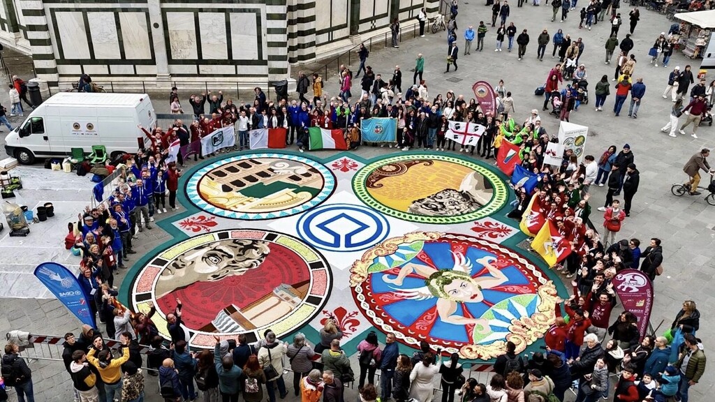 Quattordici le associazioni provenienti da Sicilia, Calabria, Abruzzo, Lazio, Marche, Toscana e Sardegna, Malta e Catalogna, che hanno collaborato per realizzare l’opera, rimasta esposta per due giorni, il 26 e 27 aprile. L’opera aveva l’intento di far immergere l’osservatore tra le meraviglie italiane, da qualsiasi prospetto la si guardasse. In particolare, riprendeva le maggiori opere d’arte dei territori annessi ai luoghi nei quali si pratica l’arte dei tappeti delle associazioni appartenenti alla Cidae (Coordinadora Internacional de Entidades de Alfombristas de Arte Efimero). La sagoma che la racchiudeva era un rimando alla nascita del Rinascimento a Firenze, più precisamente alle formelle distribuite su uno dei portoni del battistero di San Giovanni.
