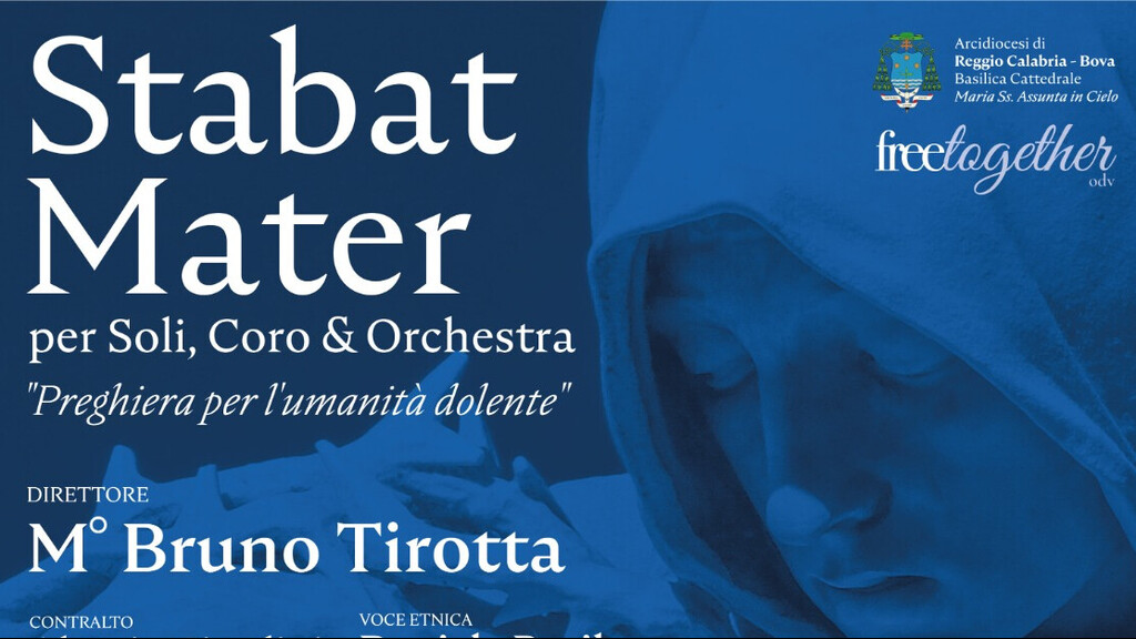 L’Arcidiocesi di Reggio Calabria–Bova Basilica Cattedrale di Maria Ss Assunta in Cielo e l’Associazione FreeTogether OdV sono liete di invitare la cittadinanza al concerto che si terrà domenica 23 giugno alle ore 20:30 presso il Duomo di Reggio Calabria. Sarà eseguito lo “Stabat Mater” di K. Jenkins, opera per Soli, Coro e Orchestra: composizione sublime, commovente, emozionante, che vedrà impegnati a cori uniti più di 100 coristi e un’orchestra di circa 40 elementi.