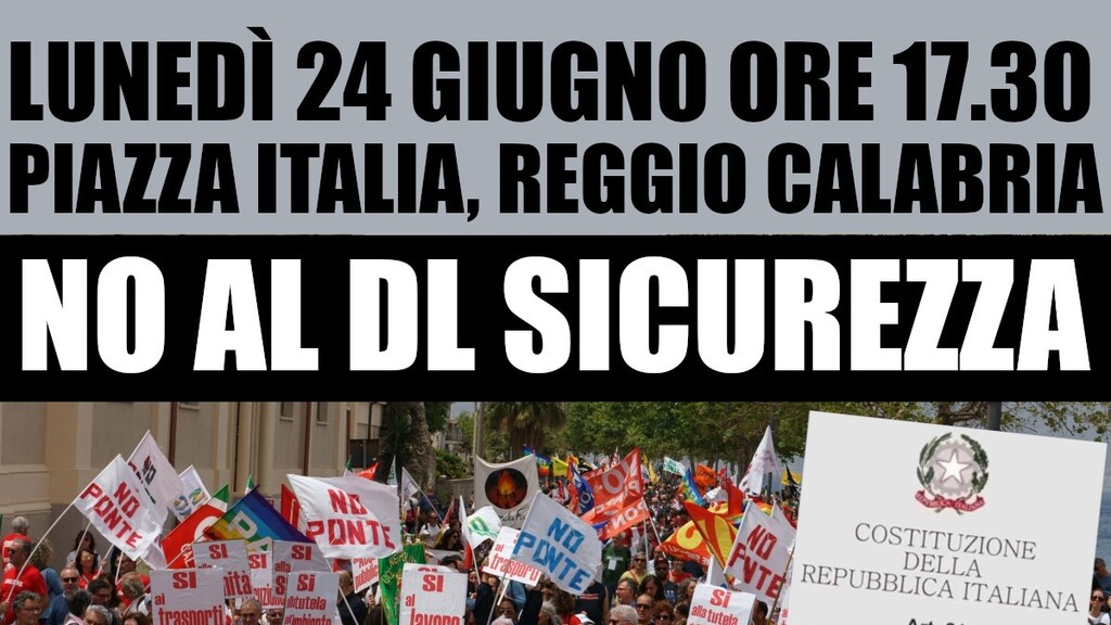 "Il 24 giugno dalle ore 17.30 saremo a Piazza Italia, di fronte la Prefettura di Reggio Calabria, per manifestare contro il nuovo DL Sicurezza voluto dai ministri Piantedosi, Nordio e Crosetto. Questo disegno di legge rappresenta un attacco frontale ai diritti civili e sociali delle fasce più deboli della popolazione, introducendo misure repressive che minacciano la libertà di espressione e la resistenza sociale, e discriminano ulteriormente le categorie più vulnerabili, come i migranti", lo afferma in una nota il comitato NO Ponte Calabria.