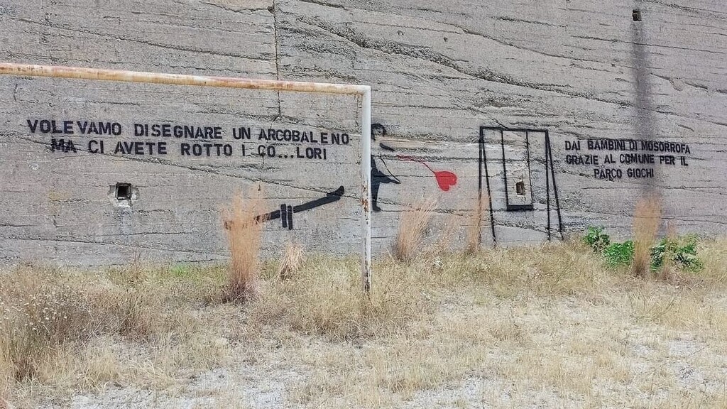 “Ci hanno segnalato che da qualche giorno, sul muro del vecchio campo sportivo di Mosorrofa, campeggia questo murale. Qualcuno ha voluto esprimere la sua protesta in modo eclatante, sarcastico e diremmo anche "poetico" contro l'ennesima promessa mancata da parte dell'amministrazione comunale. Lì dove si sarebbe dovuto realizzare un piccolo parco ludico, in un'area completamente abbandonata (come si vede in alcune foto), sorge ora un finto parco giochi; delle giostrine tutte nere, in segno di lutto o perché qualcuno ha rotto i co...lori; l'iconica bambina di Bansky protesa verso un palloncino sgonfio che cade a terra piuttosto che volare in alto. Il tutto incorniciato da due inequivocabili, ironiche frasi di protesta. Non si può non condividerlo. Cosa che speriamo facciano tutti coloro che amano Mosorrofa. Serve a dare forza alla rabbia e alle speranze di chi vive in una periferia abbandonata a sé stessa, priva di spazi vitali e dei servizi di base”, è quanto scritto sulla pagina Facebook di Attiva Mente.