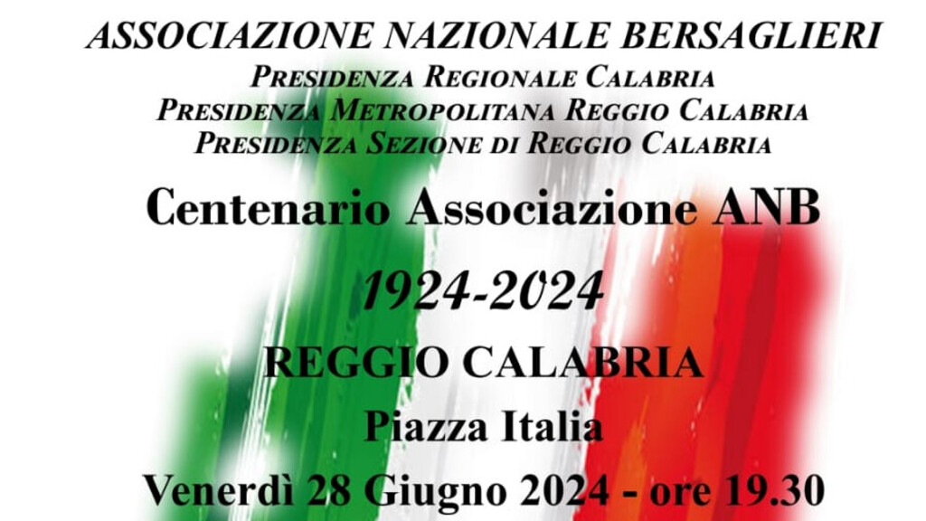 In occasione della ricorrenza della nascita dell'Associazione Nazionale Bersaglieri, la Sezione di Reggio Calabria intende ricordare tale momento con una manifestazione aperta alla cittadinanza che si svolgerà Venerdì 28 Giugno 2024, alle ore 19.30, a Piazza Italia.