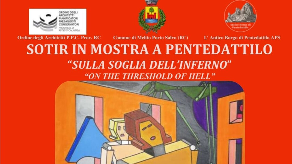 Si terrà a Pentedattilo — Comune di Melito Porto Salvo in Provincia di Reggio Calabria - in Via Lanzaro, dal 13 al 28 Luglio 2024 (orari dalle ore 10:00 alle ore 21:30) l'esposizione delle opere di Sotir. La mostra realizzata in collaborazione con l'associazione "L' Antico Borgo di Pentedattilo APS", il Comune di Melito Porto Salvo (RC) e patrocinata dall'Ordine degli Architetti P.P.C. della Provincia di Reggio Calabria, sarà presentata giorno 13 Luglio 2024 alle ore 18:00. All'evento interverranno l'Architetto Salvatore Orlando (Sindaco del comune di Melito Porto Salvo), l'Architetto Ilario Tassone (presidente dell'Ordine degli Architetti della Provincia di Reggio Calabria), l'Architetto Piero Campa (presidente dell'Ordine degli Architetti di Caltanissetta).
