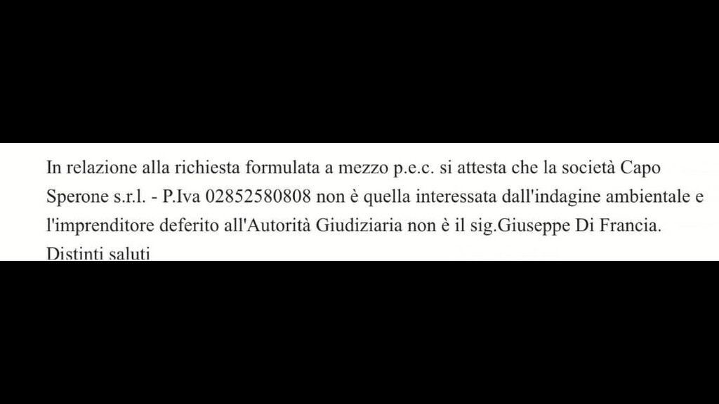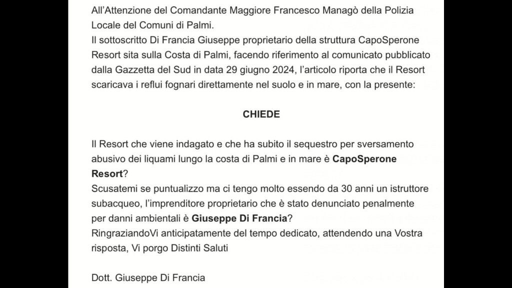 Inoltre, come da foto che si allega, la Polizia Locale di Palmi, in persona del Comandante, Magg. Dr. Francesco Managò chiarisce "che la società CapoSperone Resort non è quella interessata all'indagine e l'imprenditore deferito all'Autorità Giudiziaria non è il Sig. Giuseppe Di Francia", come riporta il contenuto della pec.