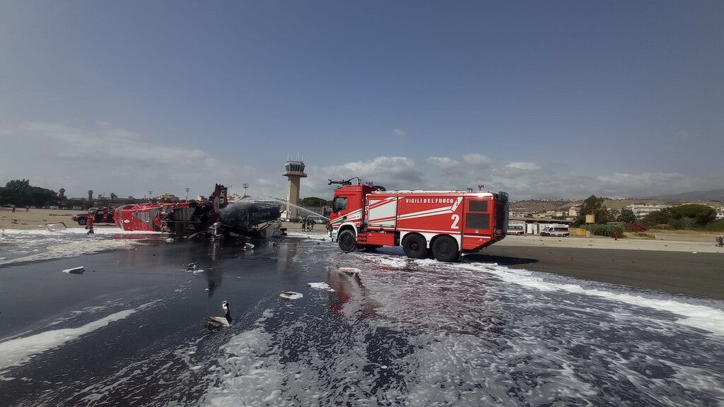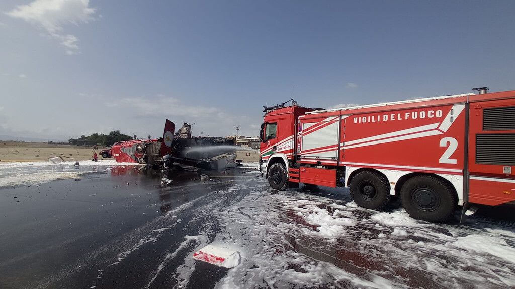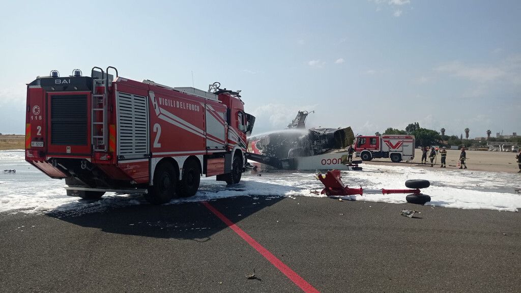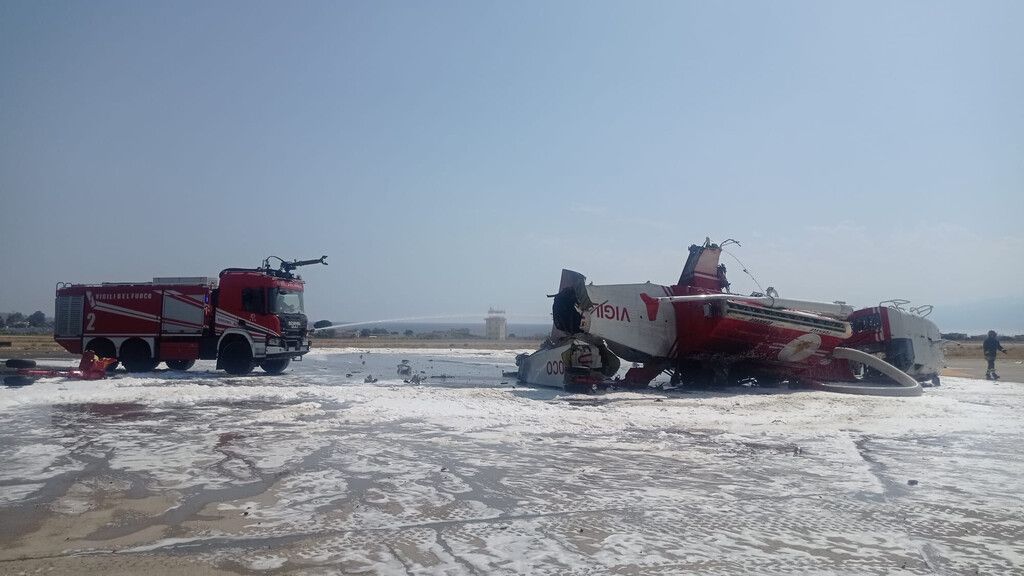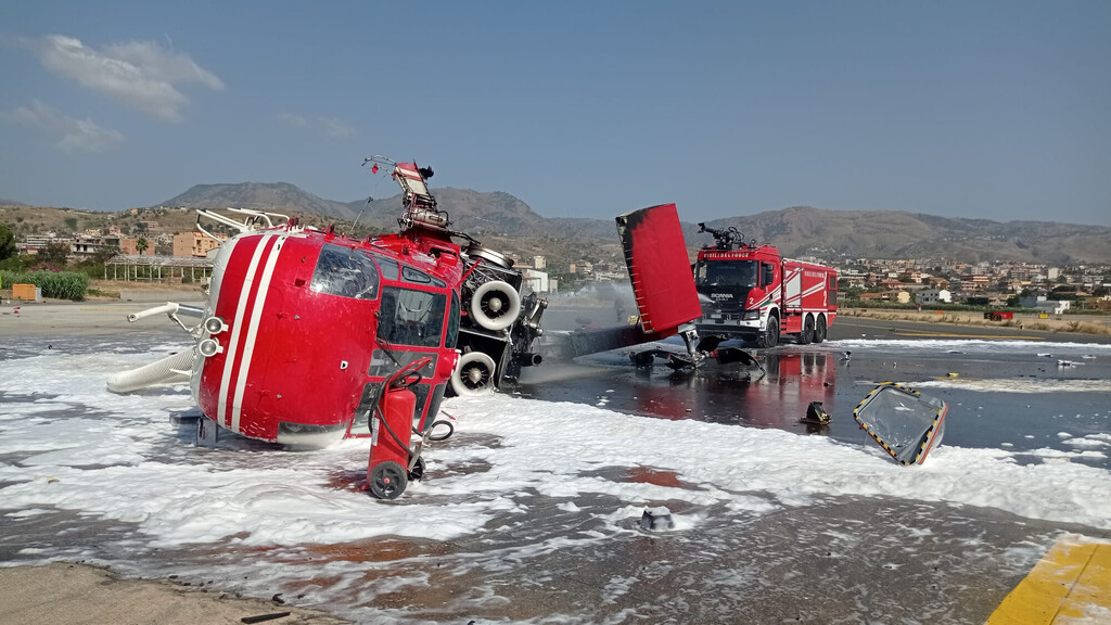 Un elicottero dei Vigili del fuoco, utilizzato per lo spegnimento degli incendi, in fiamme al momento del decollo. Attimi di apprensione per i due piloti che, fortunatamente, risultano illesi.