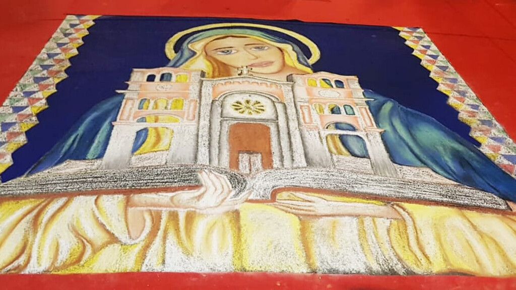 Due elementi che sono stati di ispirazione anche per gli studenti dell’Accademia di Belle Arti di Reggio, Sebastiano Nicolò e Lara P. Cerqueira de Oliveira, con un’opera fuori concorso molto apprezzata dal pubblico che ha affollato questa sorta di museo a cielo aperto. Una partecipazione fortemente voluta dal Direttore Piero Sacchetti, seguita dal Professor Francesco Scialò, con l'interessamento della Professoressa Mimma Galluso. Gli studenti hanno elaborato un progetto che facesse risaltare la figura della Madonna connessa all’idea di libro, resa concreta da un effetto pop up, con al centro la cattedrale. Lara P. Cerqueira de Oliveira, studentessa di grafica d'arte che da due anni partecipa attivamente al progetto, ci informa che la scelta dei colori è stata istintiva, come deve essere nel fluire creativo dell’arte: corallo per la cattedrale, verde acqua per il mantello della Madonna con sfumature viola e oro. “Un'esperienza che consiglio – ha dichiarato - sia per l’apprendimento di un’arte antica e peculiare, che per l’esperienza di comunità che si vive in questo contesto, con la possibilità di rientrare in un circuito internazionale".