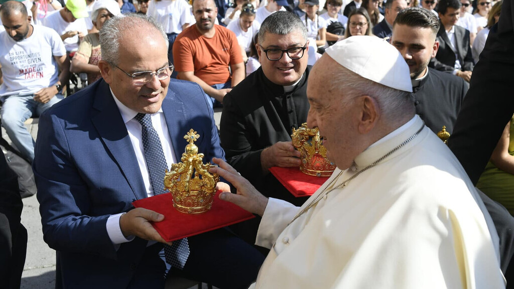 Mercoledì 28 agosto il maestro Michele Affidato, orafo della Santa Sede, ha incontrato nuovamente Papa Francesco per la benedizione delle nuove corone realizzate per la statua della Madonna di Porto Salvo in Bagnara. Opere che il prossimo 27 settembre in occasione della grande festa religiosa della comunità di Marinella di Bagnara Calabra, nel corso di una solenne celebrazione, presieduta dall’Arcivescovo Metropolita di Reggio Calabria-Bova Mons. Fortunato Morrone avverrà il sacro rito dell’incoronazione. Le corone che saranno poste sul capo della del Bambinello e della Madonna sono frutto della raccolta dell’oro votivo offerto dai fedeli durante una emozionante cerimonia svoltasi lo scorso 13 luglio. La fusione dell’oro, eseguita dal maestro Michele Affidato, affiancato dal figlio Antonio e dai suoi collaboratori, ha rappresentato un momento di profonda devozione per la comunità.