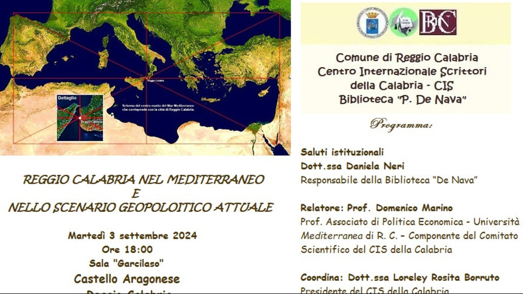 Martedì 3 settembre 2024, alle ore18:00, presso il Castello Aragonese di Reggio Calabria, il comune di Reggio Calabria, il Centro Internazionale Scrittori della Calabria e la Biblioteca “De Nava”, promuovono la conferenza “Reggio Calabria nel Mediterraneo e nello scenario geopolitico attuale”.