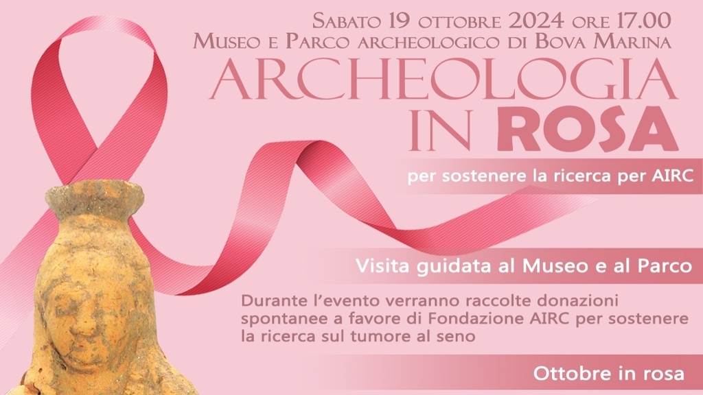 Anche il Museo e Parco archeologico di Bova Marina si aggrega alla moltitudine di associazioni, fondazioni ed enti istituzionali che partecipano alle manifestazioni previste per “l’Ottobre Rosa”, la campagna nazionale dedicata alla sensibilizzazione, prevenzione ed educazione sanitaria sul tumore al seno, una delle cause principali di mortalità per le donne nella fascia di età compresa fra i 40 ed i 69 anni. A partire dalle ore 17 di sabato 19 ottobre presso l’area del Parco è prevista una visita guidata promossa dalla Direzione del Parco e dall’Associazione socio culturale Thetis, con il patrocinio del Comune di Bova Marina e la collaborazione delle diverse realtà associative dell’area: la proloco di Bova Marina, associazione promozione Italia, i volontari del servizio civile nazionale e i referenti AIRC della zona.