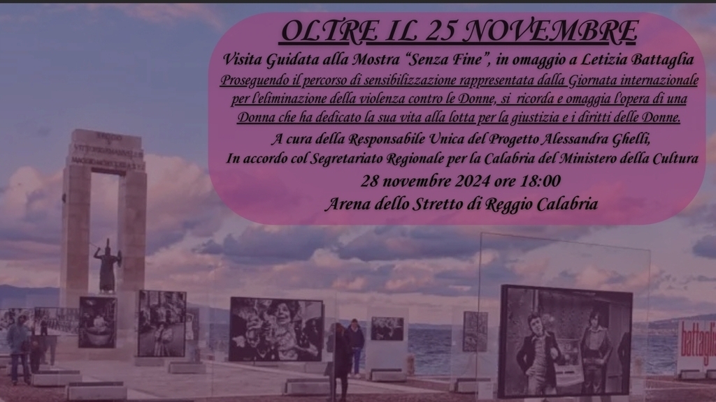Giovedì 28 novembre alle ore 18:00, col palcoscenico d'eccezione dell'Arena dello Stretto, ANPI - Sezione Ruggero Condò e NUDM Reggio Calabria invitano tutta la cittadinanza a una visita guidata alla mostra fotografica "Senza Fine", dedicata a Letizia Battaglia.