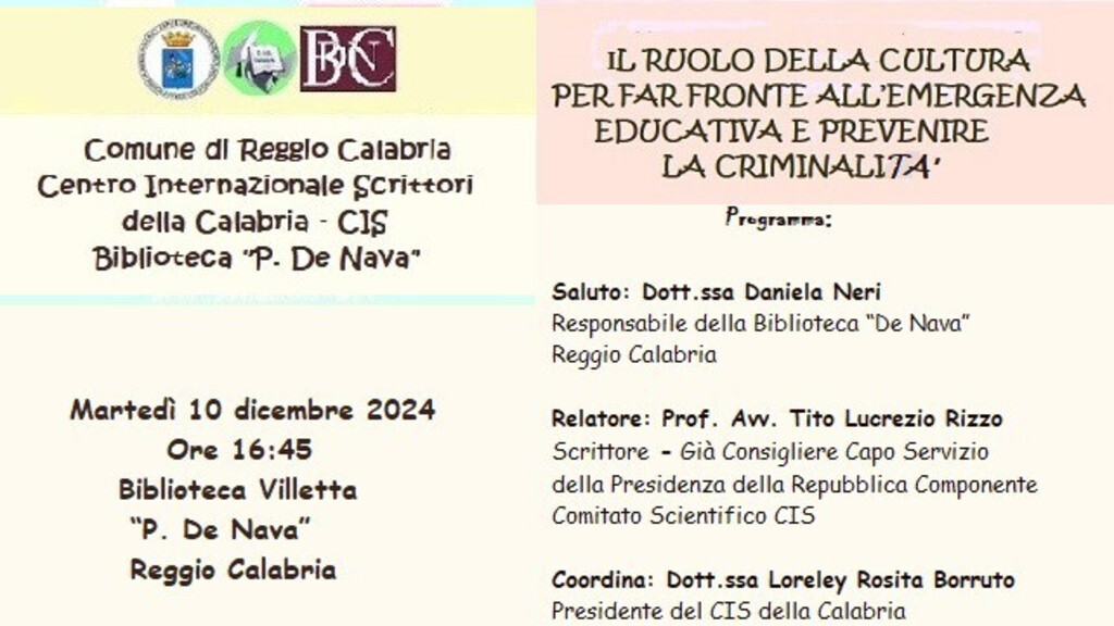 Il ruolo della cultura per far fronte all’emergenza educativa e prevedere la criminalità” è il titolo dell’incontro promosso dal Centro Internazionale Scrittori della Calabria, con il patrocinio del comune di Reggio Calabria che si svolgerà martedì 10 Dicembre 2024, alle ore 16:45 nella Sala conferenze della Biblioteca villetta “P. De Nava” di Reggio Calabria.