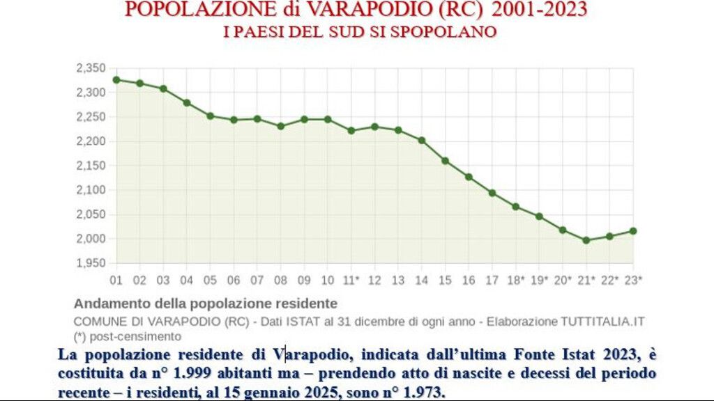 La popolazione residente di Varapodio, indicata dall'ultima Fonte Istat 2023, è costituita da n.1999 abitanti ma, in considerazione del numero delle nascite e dei decessi registrati nel periodo recente, i residenti, alla data del 15 Gennaio 2025, risultano essere pari a 1973 unità.
