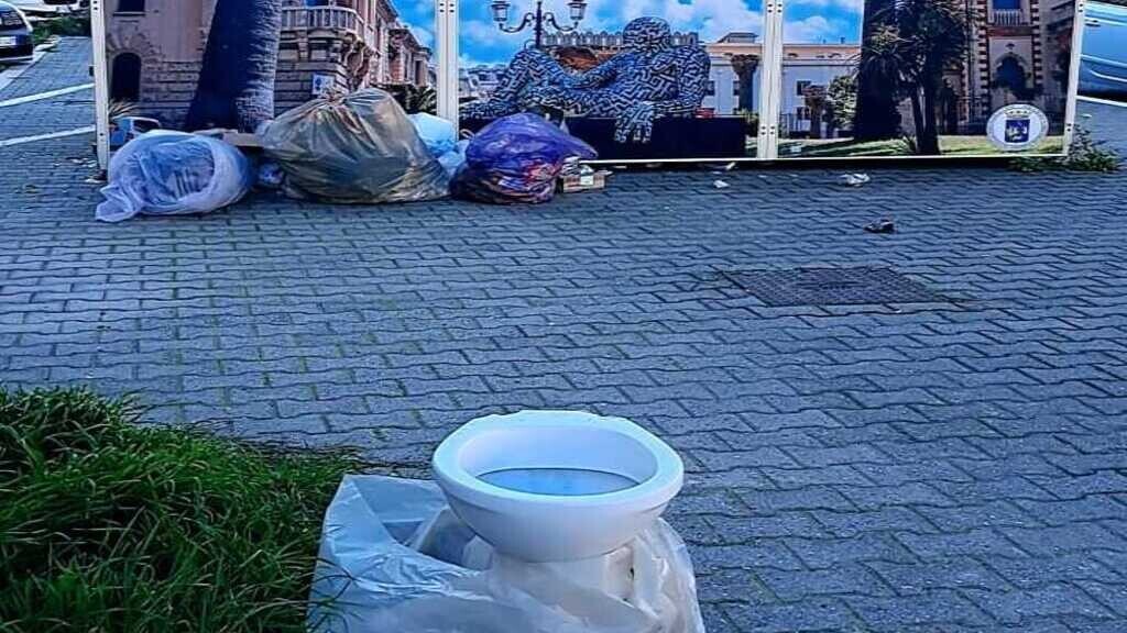L'immagine immortala un'isola ecologica in zona San Brunello con sacchetti di rifiuti e un wc gettato in mezzo agli altri rifiuti