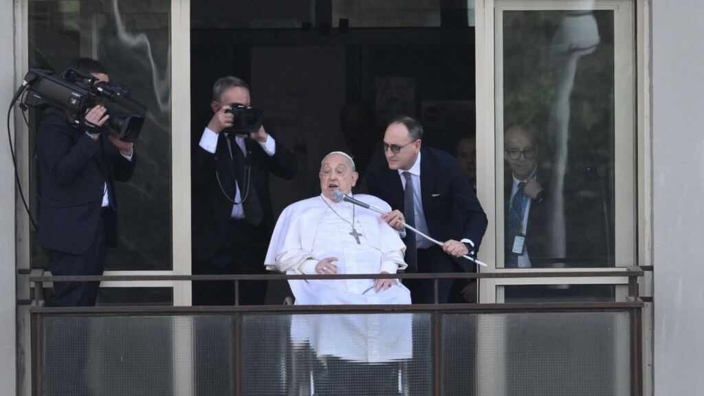 Prima Bergoglio si è affacciato da un balconcino del Gemelli in occasione dell'Angelus domenicale. E' la prima apparizione pubblica di Francesco dal suo ricovero il 14 febbraio scorso.