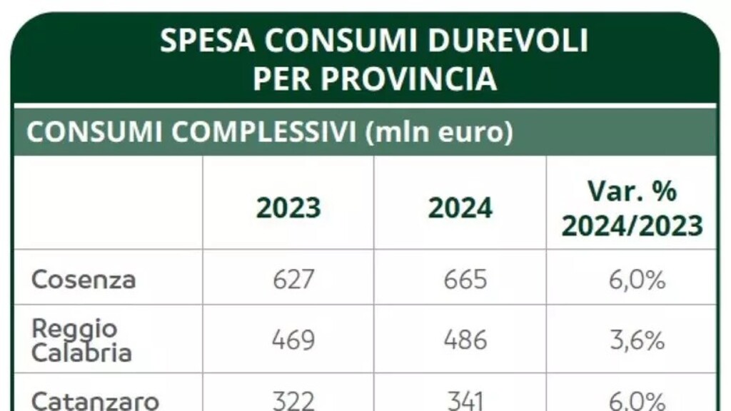 In Calabria, nel 2024, sono stati spesi un miliardo e 765 milioni di euro in beni durevoli con un incremento sull'anno precedente del +5,3%, settimo miglior dato italiano che supera la media nazionale del +4,5%.