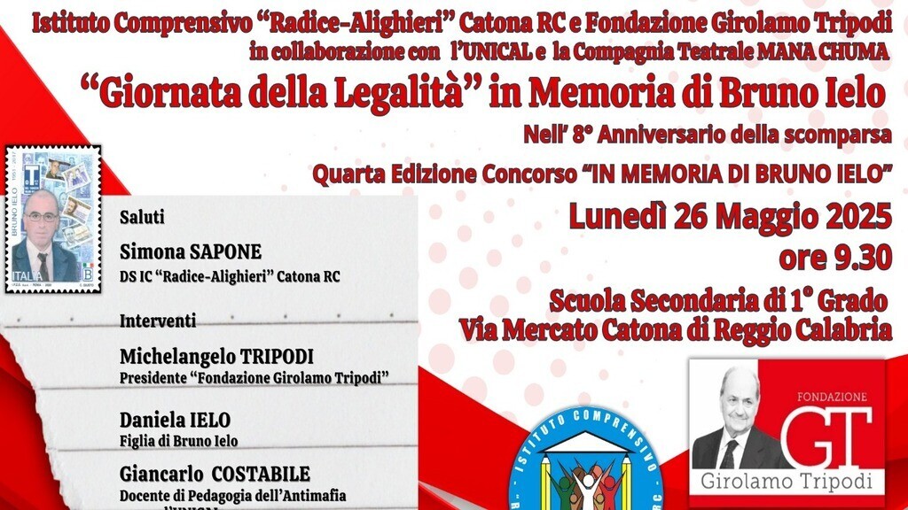 Sarà dedicata al ricordo di Bruno Ielo, ex Direttore dei servizi amministrativi dell’Istituto Comprensivo “Radice - Alighieri” di Catona, la “Giornata della legalità” in programma il 26 maggio prossimo, presso la Scuola Secondaria di 1° grado di Via Mercato (ex CIAPI). L’evento, promosso dall’Istituto Comprensivo insieme alla Fondazione “Girolamo Tripodi”, con la collaborazione dell’UNICAL e della Compagnia teatrale Mana Chuma, vuole mantenere viva la memoria di un uomo che otto anni fa ha pagato con la vita la sua scelta di opporsi con coraggio alla ‘ndrangheta.