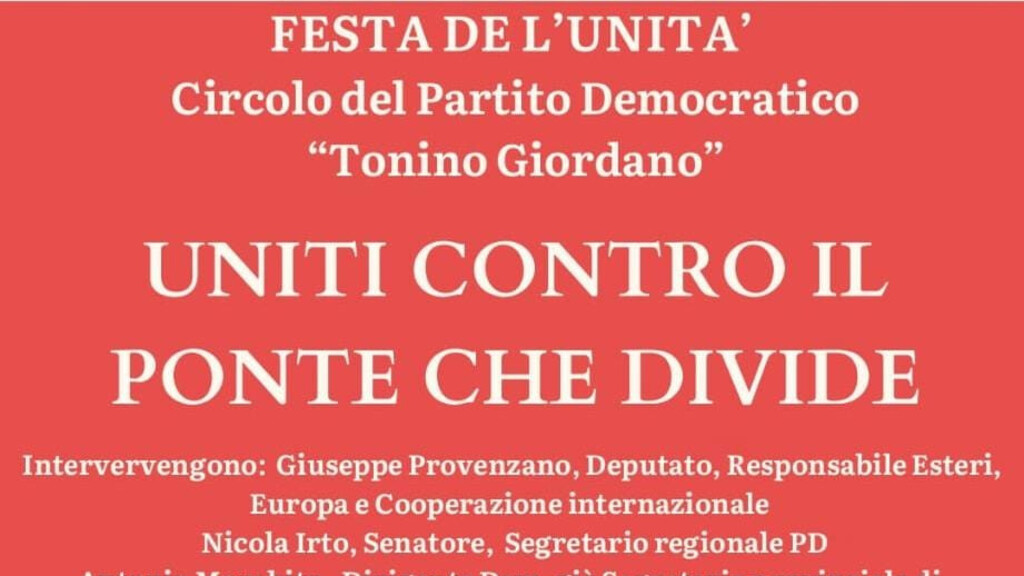 "Nella Piazzetta Calandruccio, a Cannitello, giovedì 3 luglio, a partire dalle ore 18,30, daremo vita ad un'iniziativa politica contro il Ponte delle falsità, destinato a moltiplicare ecomostri e devastazione. I Democratici dello Stretto, con Peppe Provenzano, rappresenteranno le ricadute politiche dell'accelerazione di Salvini sull'opera, evidenzieranno i passaggi compiuti per portare verità, scienza e coscienza laddove regna l'ideologismo più pericoloso: quello degli interessi partitici ed economici lontani dalle esigenze dello Stretto" - inizia così una nota del Circolo Pd "Tonino Giordano" di Villa San Giovanni.