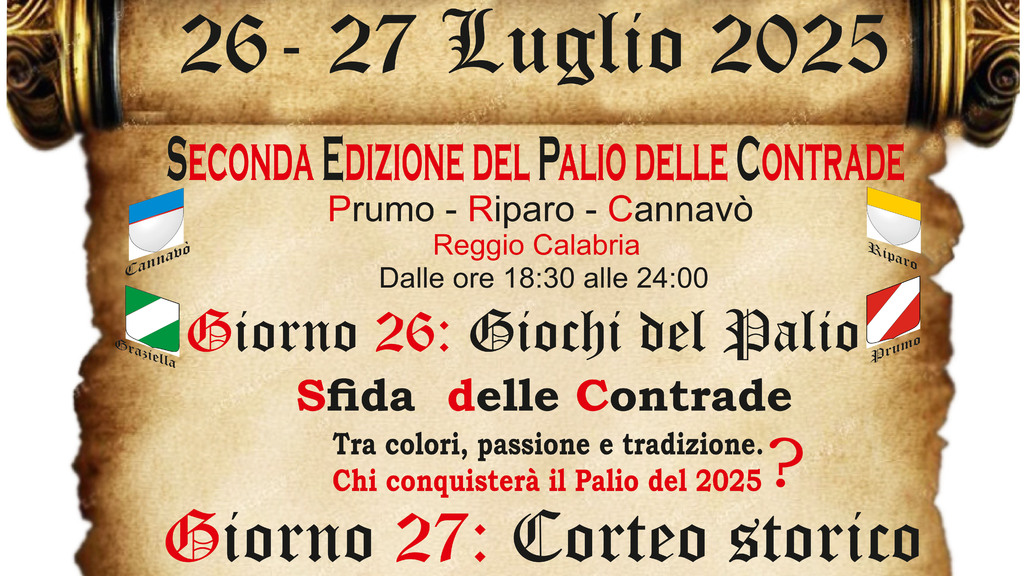 Grande attesa per il "Palio Storico delle Contrade". Il quartiere di Prumo–Riparo–Cannavò si veste di storia e tradizione: il 26 e 27 luglio torna un evento tanto atteso dalla comunità reggina e non, che trasformerà le strade e le piazze in un affresco vivente di epoca rinascimentale. La seconda edizione del Palio delle Contrade è organizzata dalla Parrocchia San Nicola di Bari e Santa Maria della Neve, in collaborazione con le associazioni Ape Reggina APS e Oratorio Sant’Agata e gode del patrocinio del Comune di Reggio Calabria, della Città Metropolitana e del Consiglio Regionale della Calabria.
