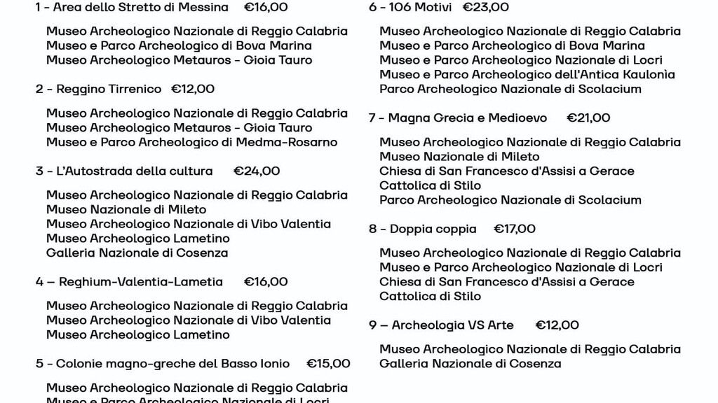 Nove gli itinerari proposti, pensati per valorizzare le relazioni storiche, geografiche e culturali tra i luoghi della cultura afferenti alla rete museale regionale. Dai Bronzi di Riace alle colonie magnogreche, dalla Magna Grecia al Medioevo, fino alla scoperta dei paesaggi archeologici attraversati dall'Autostrada del Mediterraneo e dalla Statale 106: il biglietto integrato consente al visitatore di costruire il proprio percorso in libertà, con un unico titolo d'ingresso e uno sconto del 20% rispetto alle tariffe ordinarie.