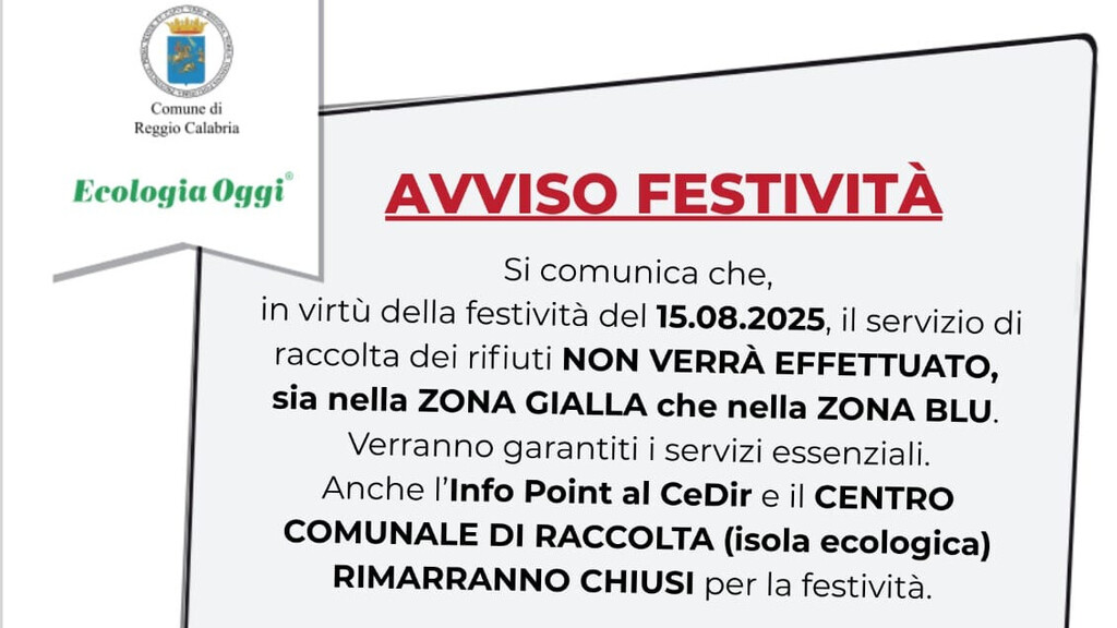 Il settore Ambiente del Comune di Reggio Calabria rende noto che, in virtù della festività del 15.08.2025, il servizio di raccolta dei rifiuti non verrà effettuato, sia nella Zona Gialla che nella Zona Blu.