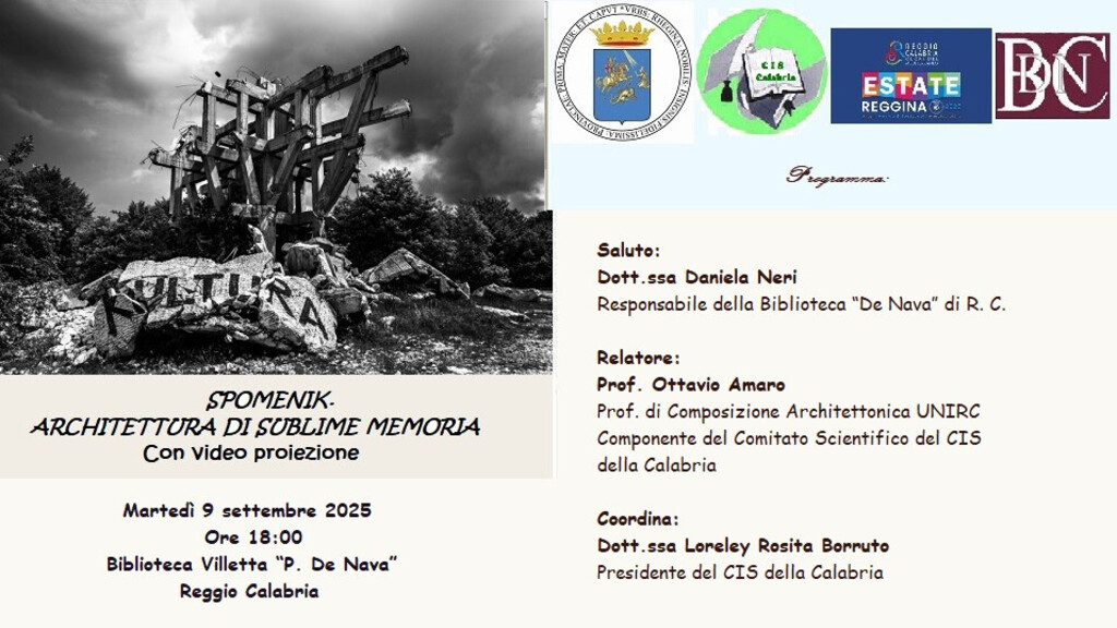 Per il ciclo di incontri sull’Architettura mondiale, martedì 9 settembre, ore 18:00, nei locali della Biblioteca Villetta “P. De Nava” di Reggio Calabria, il Comune di Reggio Calabria, il Centro Internazionale Scrittori della Calabria e la Biblioteca, nell’ambito dell’“Estate Reggina 2025”, promuovono la manifestazione “Spomenik. Architettura di sublime memoria”.