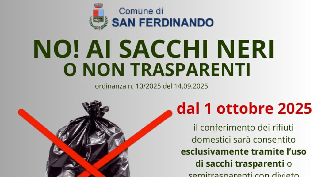 L'Amministrazione Comunale di San Ferdinando ha introdotto una nuova misura per elevare gli standard di raccolta differenziata, incrementare i risultati e ottimizzare la gestione del ciclo dei rifiuti. A partire dal 1 ottobre 2025, grazie all’ordinanza del sindaco nr. 10-2025, sarà vietato l’uso dei sacchi neri o comunque non trasparenti per il conferimento di qualsiasi tipo di rifiuto, sia per le utenze domestiche che per quelle non domestiche.