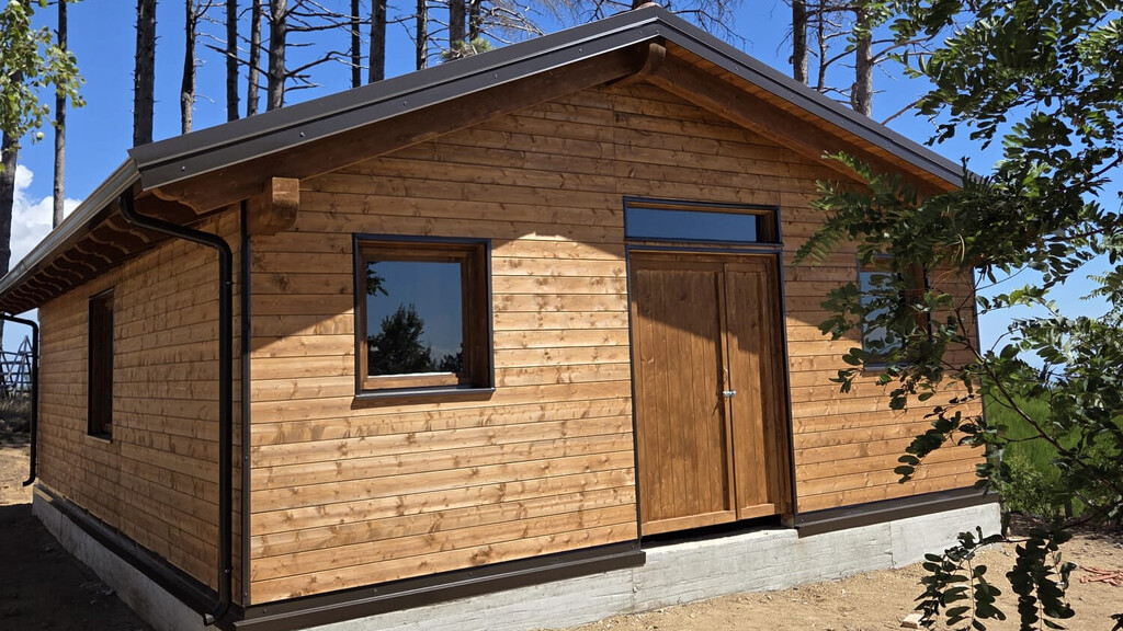I lavori hanno visto il rifacimento della platea di fondazione, la costruzione della struttura portante, realizzata in legno lamellare di abete a vista, con perlinato di abete, con porta pilastro in ferro zincato a freddo e viterie per legno. Per l’impermeabilizzazione è stato utilizzato telo a vapore, sistema XPS di 10 cm e guaina adesiva ardesiata, con manto in coppi, compreso di pezzi speciali per la messa in opera. Le chiusure verticali sono state realizzate con perline in abete sia interne che esterne dello spessore di cm. 3,5, con struttura portante in legno di abete di 12 cm ed interposizione di lana di roccia dello spessore di 12 cm..
