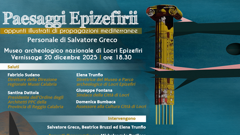 Sarà inaugurata venerdì 20 dicembre alle ore 18.30, presso il Museo archeologico di Locri Epizefiri, la mostra “Paesaggi Epizefirii: appunti illustrati di propagazioni mediterranee” di Salvatore Greco, a cura di Elena Trunfio, con allestimento firmato dallo stesso artista insieme a Beatrice Bruzzì. L’esposizione resterà visitabile fino al 31 gennaio e nasce dalla collaborazione con l’Ordine degli Architetti PPC della Provincia di Reggio Calabria, con il patrocinio del Comune di Locri e il supporto dell’Associazione per il Disegno Industriale – Sezione Calabria, 500X100, la Biennale dello Stretto e la Fondazione Le Città del Futuro.