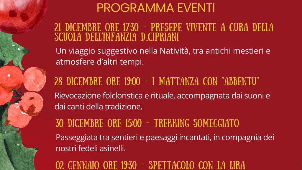 - Il 28 dicembre la voce e i suoni dei Mattanza accompagneranno il pubblico con Abbentu, una rievocazione musicale legata alla Natività.