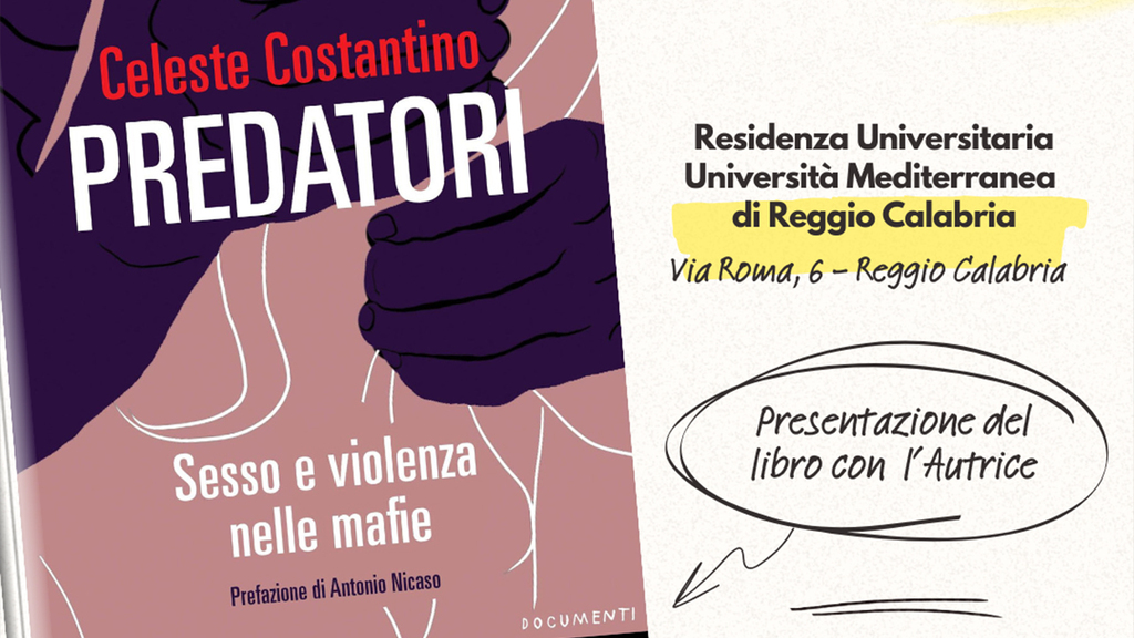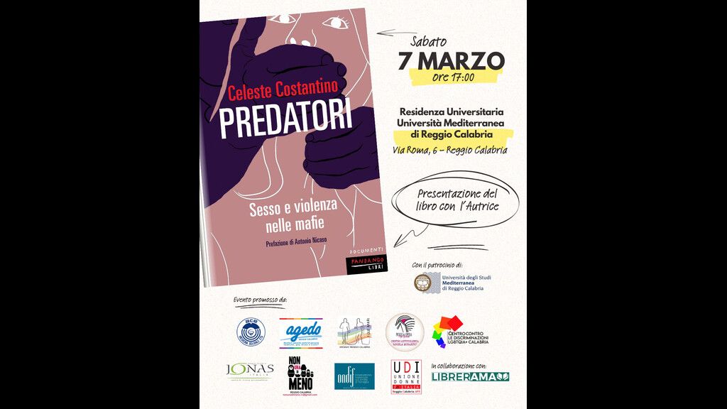 Sabato 7 marzo alle ore 17:00, presso la Residenza Universitaria dell’Università Mediterranea di Reggio Calabria (Via Roma, 6), si terrà la presentazione del libro “Predatori. Sesso e violenza nelle mafie” di Celeste Costantino, con prefazione di Antonio Nicaso, pubblicato da Fandango Libri.