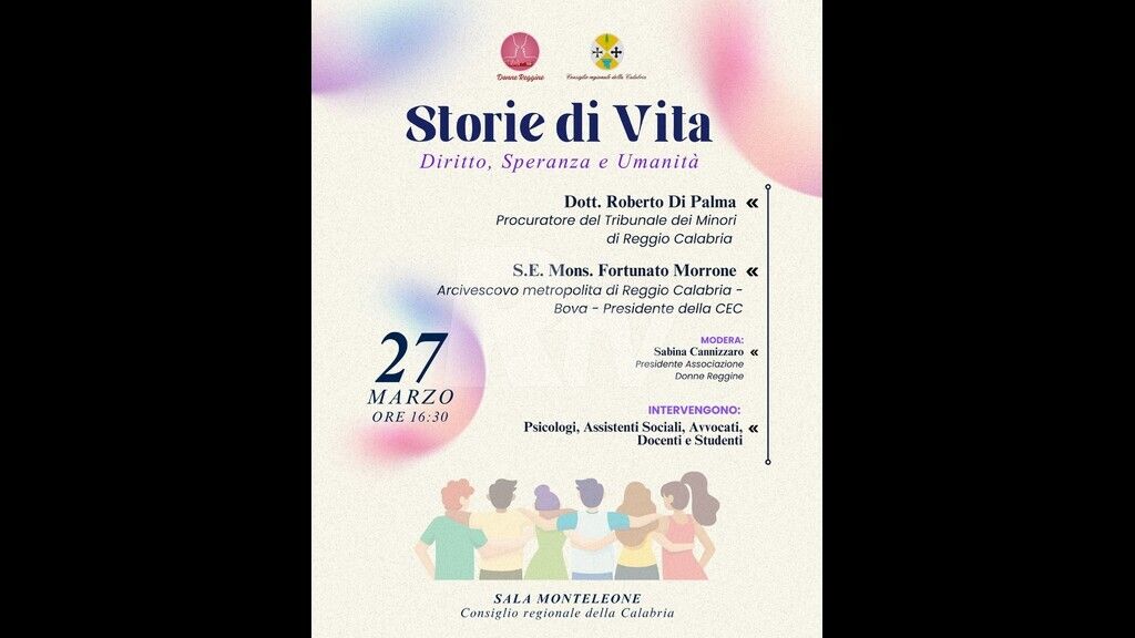 Si terrà venerdì 27 marzo alle ore 16:30, presso la Sala Monteleone del Consiglio regionale della Calabria, l'incontro dal titolo "Storie di Vita. Diritto, Speranza e Umanità", promosso dall'Associazione Donne Reggine. L'iniziativa si propone come un momento di riflessione e confronto su temi di grande rilevanza sociale, mettendo al centro la dignità dei giovani, tra il rispetto della giustizia e il diritto all'umanità.