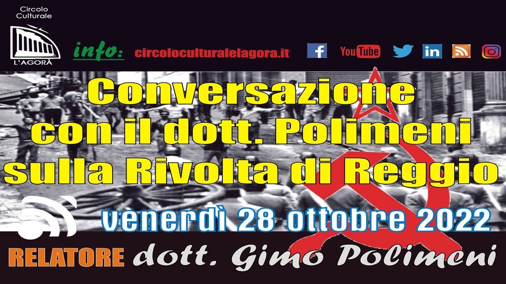 "Conversazione con il dott. Polimeni sulla Rivolta di Reggio” è il titolo della nuova conversazione sui Moti di Reggio Calabria del 1970. Nel corso del colloquio saranno stati affrontati diversi aspetti sia per quanto riguarda ciò che accadde a Reggio in quei frangenti storici ed anche le vicissitudini che la Città vive in questi momenti. Girolamo Polimeni è stato Assessore presso il Comune di Reggio Calabria per 6 anni con delega nei settori della cultura, del turismo e della promozione dell’immagine della città. Tenuto conto dei protocolli di sicurezza anti-contagio e dei risultati altalenanti della pandemia di COVID 19 e nel rispetto delle norme del DPCM del 24 ottobre 2020 la conversazione sarà disponibile, sulle varie piattaforme Social Network presenti nella rete, a far data da venerdì 28 ottobre.