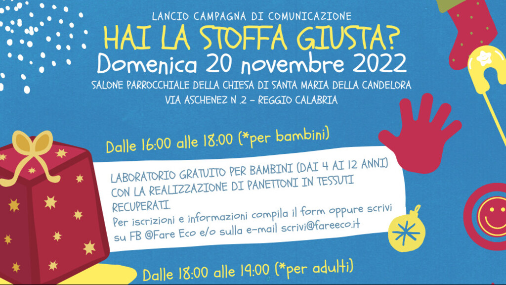 Il 20 novembre dalle ore 16:00 alle 18:00, vi sarà il laboratorio gratuito per bambini dai 4 ai 12 anni, con la realizzazione di panettoni in tessuti recuperati. I panettoni salvadanai, realizzati dai bambini nel corso del laboratorio con tessuti recuperati, serviranno per la campagna "panettone sospeso", un’iniziativa dell’Associazione Pandora che si ispira alla tradizione napoletana del “caffè sospeso”: come a Napoli il caffè è un simbolo, così il panettone lo sarà per Reggio Calabria. Sulla pagina facebook @corredinosospeso verrà pubblicata la mappa di dove verranno posizionati. Se sei un’attività commerciale puoi richiedere il panettone salvadanaio per ospitarlo nel tuo negozio, manda un messaggio WhatsApp al 3273214562 o e-mail a  associazionepandorarc@gmail.com.
