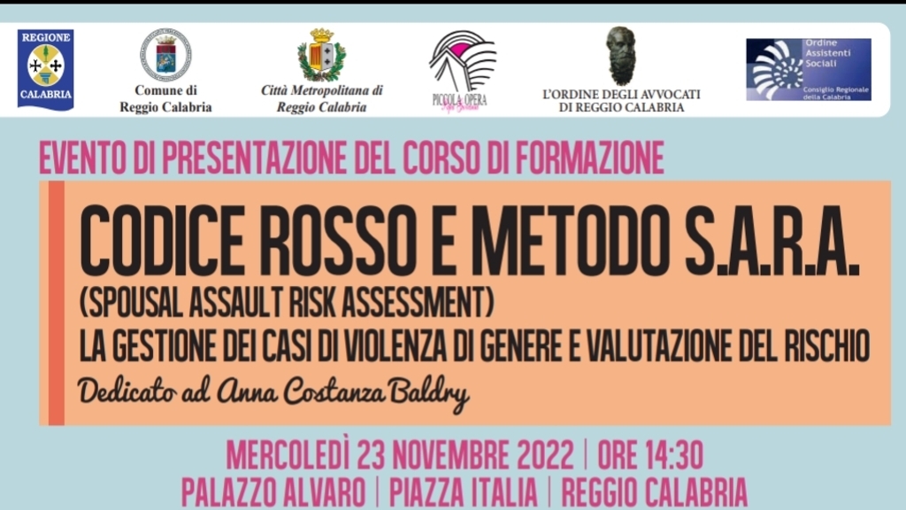 “Codice rosso e metodo S.A.R.A. La gestione dei casi di violenza di genere e valutazione del rischio”. E’ questo il titolo del percorso di formazione specialistico dal taglio giuridico, criminologico, psicologico, sociale, dedicato ad Anna Costanza Baldry ed organizzato dalla Casa Rifugio “A. Morabito”, gestita dalla Piccola Opera Papa Giovanni Onlus. Il percorso specialistico, distinto in otto incontri ed aperto ai professionisti del settore, vedrà domani l’evento di lancio e presentazione, presso la Città Metropolitana di Reggio Calabria, alle ore 15:00. Vi prenderanno parte per i saluti istituzionali il prof. Pietro Siclari, la senatrice Tilde Minasi, il presidente Rosario Infantino, per le relazioni in materia si avvicenderanno la prof.ssa Elisa Vermiglio, la prof.ssa Donatella Loprieno, la dott.ssa Francesca Mallamaci e l’avv. Luigia Barone. All’avv. Lucia Lipari saranno affidate le conclusioni, mentre all’avv. Luciano Squillaci, la moderazione del dibattito.