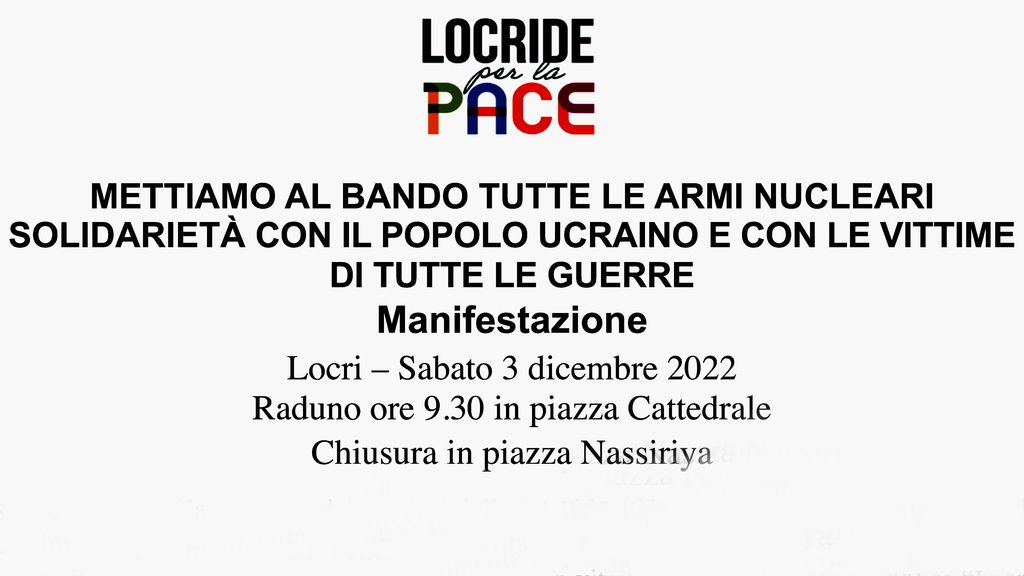 Il Comitato "Locride per la Pace”, sigla che riunisce i promotori della manifestazione del 3 dicembre a Locri per la Pace: ANPI, Assemblea dei Sindaci della Locride, il Vescovo di Locri - Gerace, SER Francesco Oliva, Associazione 22 ottobre, la Riviera, comunica, attraverso una nota, che al momento aderiscono e parteciperanno al corteo più di 20 associazioni e movimenti.