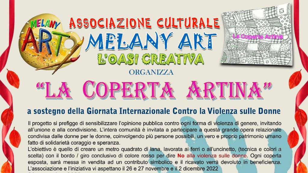 “Nel corso di questa giornata si effettuerà la vendita solidale di beneficienza, attraverso un contributo simbolico alla Coperta Artina, (realizzata dalle donne dell’associazione e singole cittadine, in un metro quadrato di lana, lavorata ai ferri o all’uncinetto, (tecnica e colori a scelta) con il bordo/giro conclusivo di colore rosso per dire No alla Violenza sulle Donne. Ogni coperta esposta, sarà messa in vendita ad un contributo simbolico ed il ricavato verrà devoluto in beneficienza.