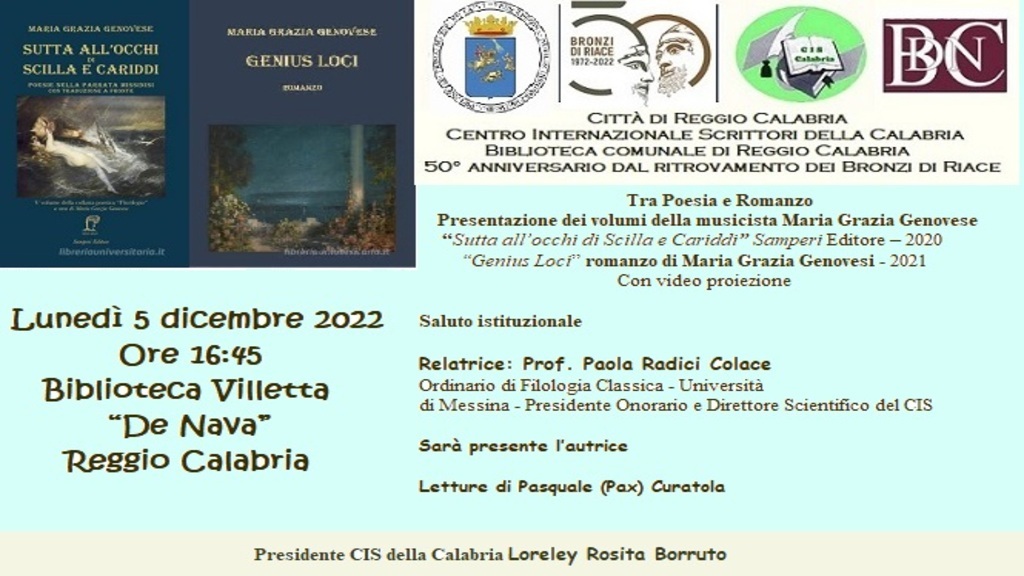 Nei locali della Biblioteca Villetta “P. De Nava” di Reggio Calabria, il Comune di Reggio Calabria, il Centro Internazionale Scrittori della Calabria e la Biblioteca “De Nava”, lunedì 5 dicembre 2022, alle ore 16:45, presentano “Sutta all’occhi di Scilla e Cariddi” silloge di poesie, Samperi Editore (2020) e il romanzo storico “Genius loci” (2021) di Maria Grazia Genovese. Dopo il saluto istituzionale illustrerà i due volumi la prof.ssa Paola Radici Colace, ordinario di Filologia classica dell’Università di Messina, presidente onorario e direttore scientifico del CIS. Sarà presente l’autrice Maria Grazia Genovese. Brani scelti saranno letti da Pasquale (Pax) Curatola. “Sutta all’occhi di Scilla e Cariddi” è una raccolta di poesie. Lo stretto tra Sicilia e Calabria fa da scenario alla silloge poetica in dialetto messinese, una lingua intensa, drammatica, ricca di storia e di pathos. Il romanzo “Genius loci” racconta una storia che si staglia nella Messina di oggi e di ieri, dalla cacciata dei Borboni, fino al terremoto del 1908. Il ritrovamento dei diari di una trisavola dell’autrice, la induce a ripercorrere un passato complesso e glorioso. Il romanzo è un’opera che attraverso uno sguardo delicato e indiscreto riporta alla luce comportamenti psicologici dei personaggi: l’amore, il desiderio, la nostalgia. Ogni personaggio vive le contraddizioni di un’epoca che si avvia verso la modernità e verso il progresso.