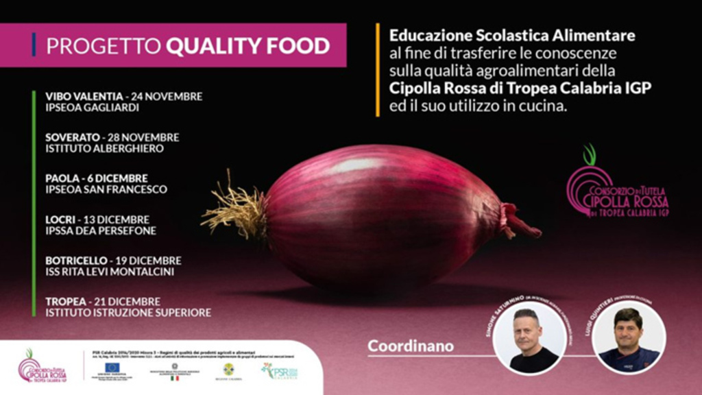 Quality Food - il progetto di educazione scolastica alimentare - dedicato alla valorizzazione della cipolla rossa di Tropea, approda all’Istituto Alberghiero “Dea Persefone” giorno martedì 13 dicembre 2022 dalle ore 10 in poi, presso la sede di Siderno. Una giornata a stretto contatto con i tecnici del Consorzio della Cipolla Rossa di Tropea Calabria Igp. Obiettivo del progetto è quello di far conoscere tutte le potenzialità agroalimentari di questo prezioso alimento e il suo utilizzo in cucina.