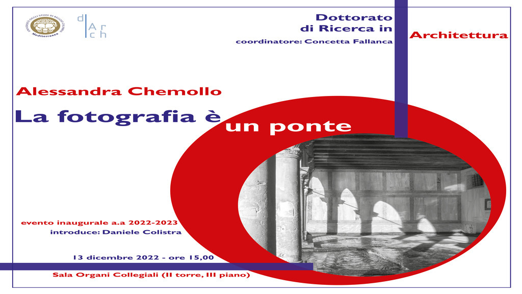 Martedì 13 dicembre alle 15,00 nella Sala Organi Collegiali (II torre, 3° piano) della Cittadella Universitaria, si terrà l’evento inaugurale dell’anno accademico 2022-23 del Dottorato di Ricerca in Architettura con la presenza di Alessandra Chemollo, fotografo di architettura e docente presso lo IUAV.