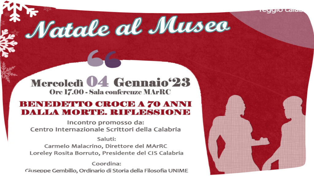 Domani pomeriggio, 4 gennaio, in sala conferenze dalle ore 17.00, si parlerà di “Benedetto Croce. A 70 anni dalla morte”, nell’incontro promosso dal Centro Internazionale Scrittori della Calabria,