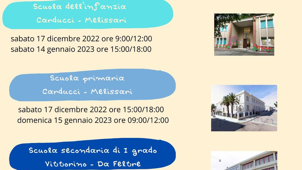 di primo grado Vittorino da Feltre e dalle ore 15:00 alle 18:00 alla scuola dell’infanzia.